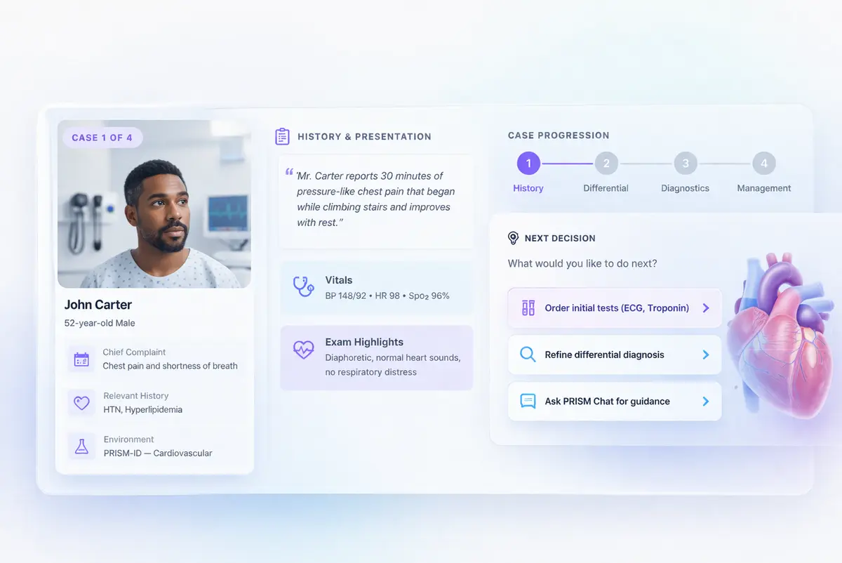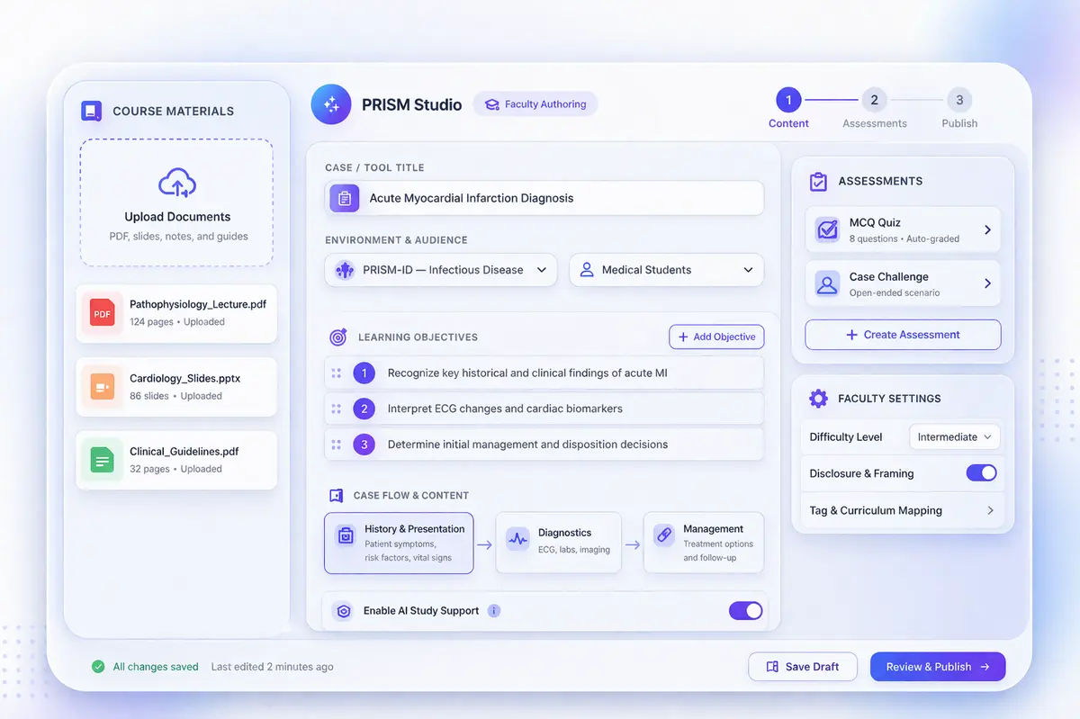 PRISM helps faculty turn teaching priorities, learning objectives, and clinical tradeoffs into guided clinical reasoning rather than static cases or generic chat bots.